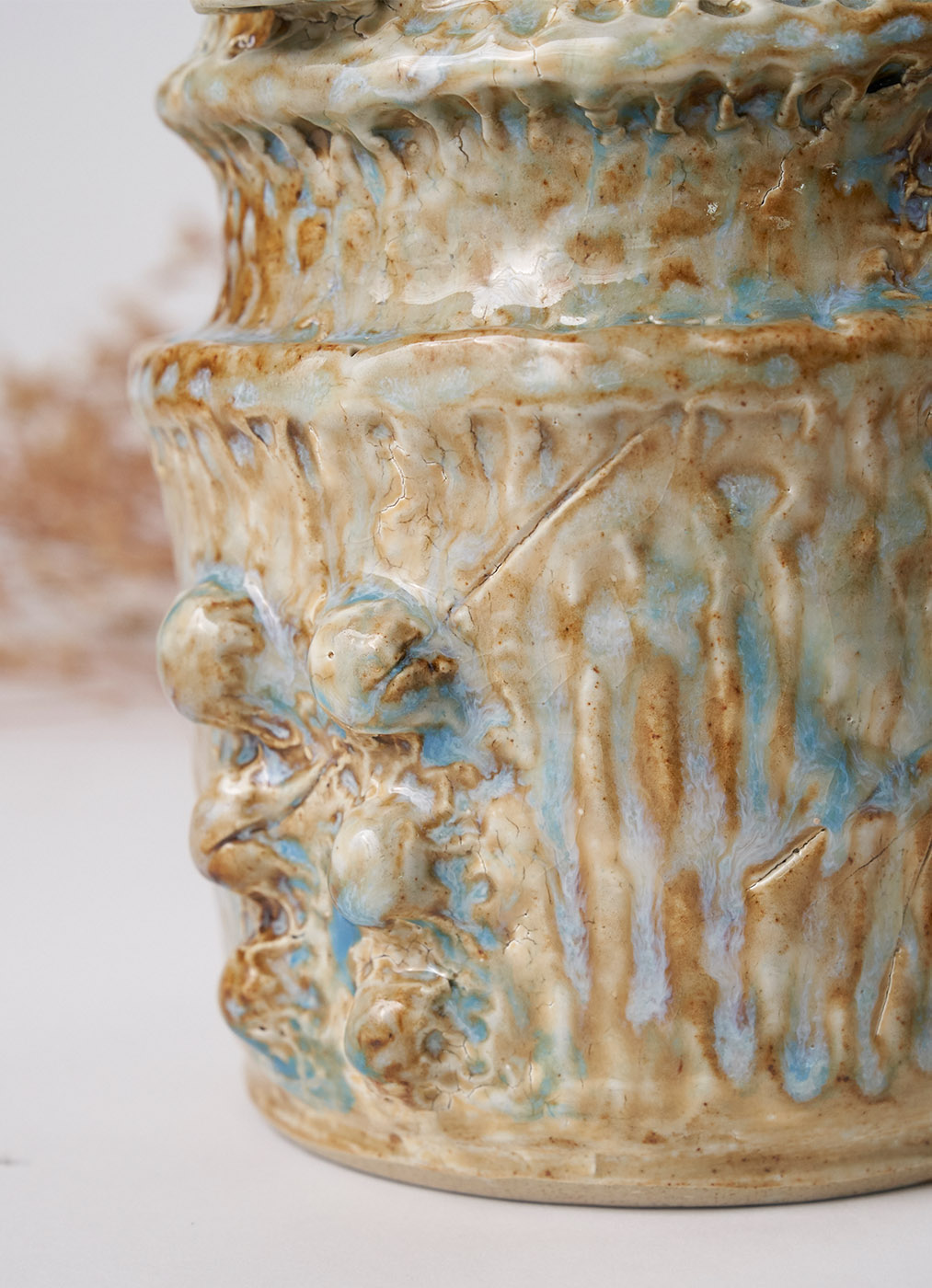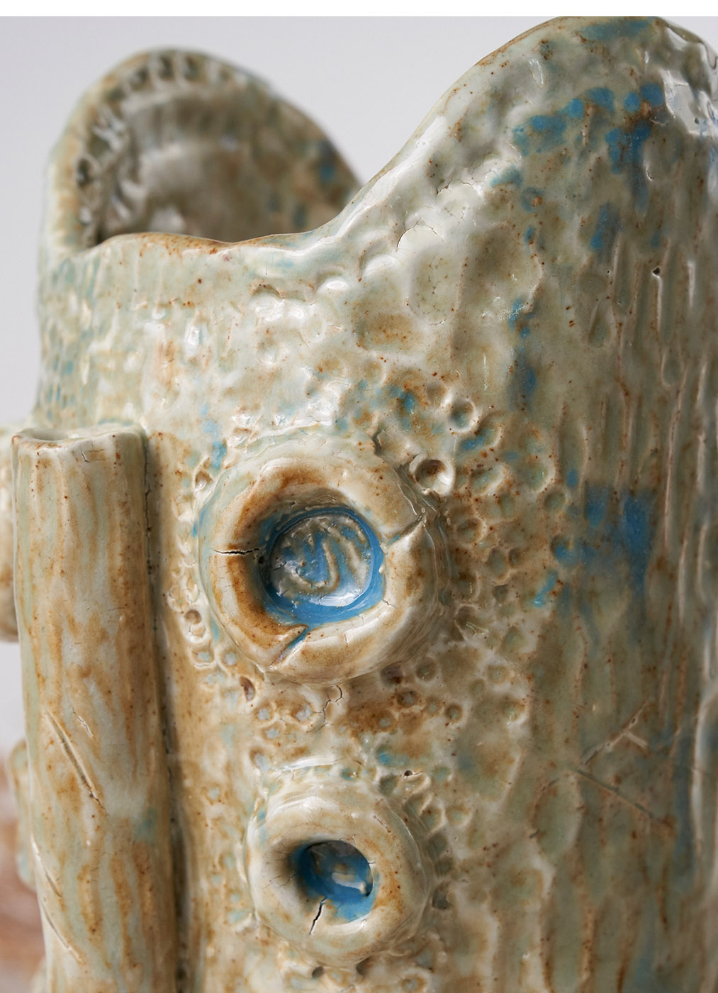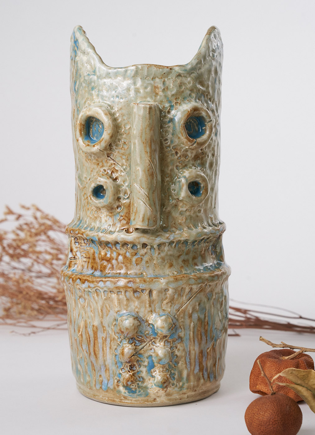 它像一只来自远古的猫,静静伫立,带着未解的秘密。粗犷的纹理,如风与雨雕刻的印记,釉色间泛起的蓝绿,仿佛苔藓在石壁上生长。它的眼睛深邃而宁静,似乎穿越了千年的森林,把自然的气息凝结在这片陶土中。它不是器物,更像一位森林的神兽,守护着原野,也守护着你的梦境。