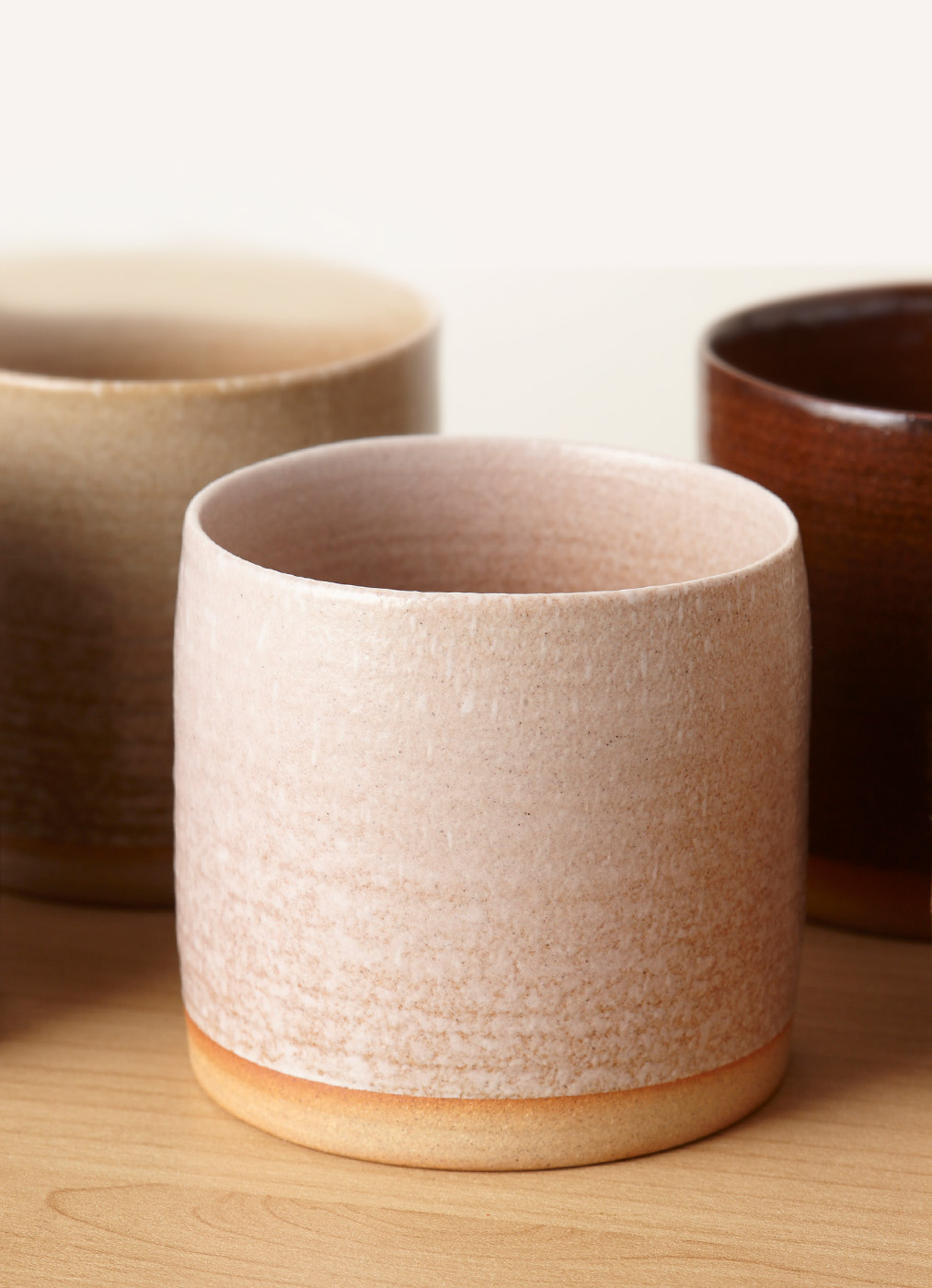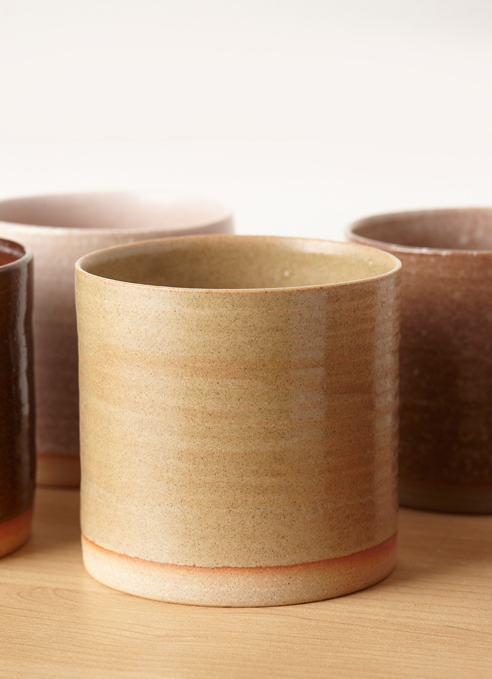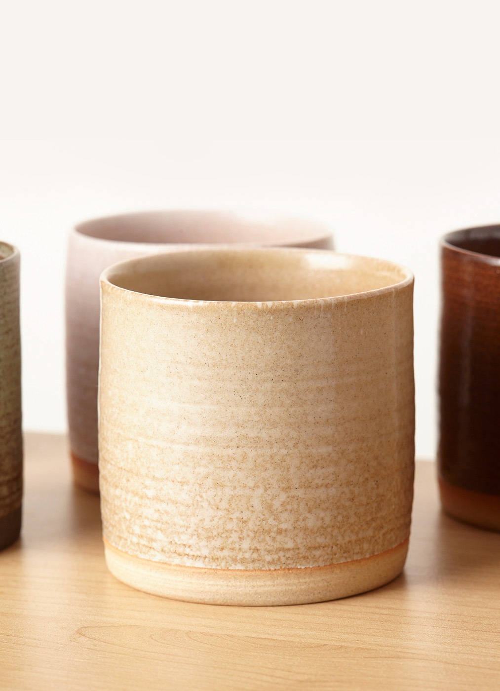 这一组陶瓷杯,以四季为灵感,不是直接描摹春花秋叶,而是取那一抹流动的感受。色彩沉静,如风拂过原野,不喧哗,却携着土地的温度。